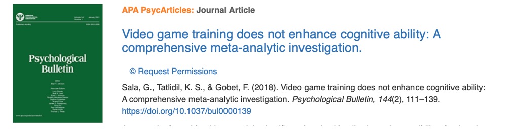 第三个荟萃分析(k=359)研究了电子游戏训练对参与者认知能力的影响。在所有三个模型中都发现效应值很小或为零。这些结果表明,整体认知能力和电子游戏技能只有微弱的关系,且研究并未发现玩电子游戏和增强认知能力之间存在的因果关系。https://doi.org/10.1037/bul0000139