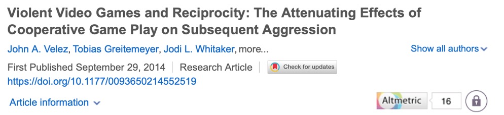 2016年Velez, Greitemeyer等人在Communication Research期刊上发表对于暴力电子游戏不同类型进行探究。通过实验表明,合作性的暴力游戏可以抵消暴力电子游戏的攻击性增加效应。
