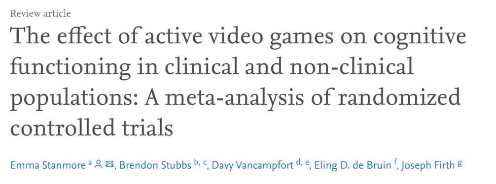 一些学者对玩电子游戏与提高认知能力之间的相关性进行探讨。Stanmore, Stubbs 等学者在2017年Neuroscience & Biobehavioral Reviews期刊发表的研究中表示使用电子游戏将身体活动和认知任务结合起来,可能提供一种新的改善认知功能的策略。研究者确定了17个符合条件的随机对照实验,其中包含926名参与者的认知结果数据。随机效应荟萃分析发现,电子游戏明显改善了整体认知(g = 0.436,95% CI = 0.18-0.69,p = 0.001)。此外,研究在健康的老年人和患有神经认知障碍的临床人群中都观察到了电子游戏的好处(所有p<0.05)。