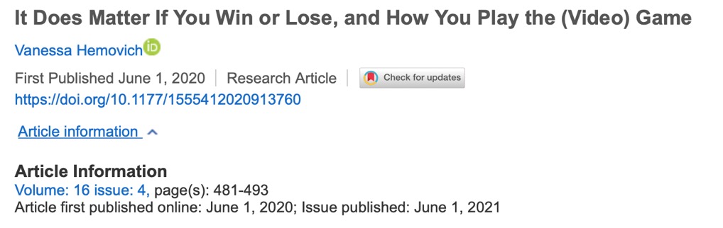 也有研究指出了游戏输赢而非游戏暴力程度对玩家行为的潜在影响。与以往大多研究暴力电子游戏学者将研究主要集中在玩家的攻击性行为上不同,Hemovich 在2021年