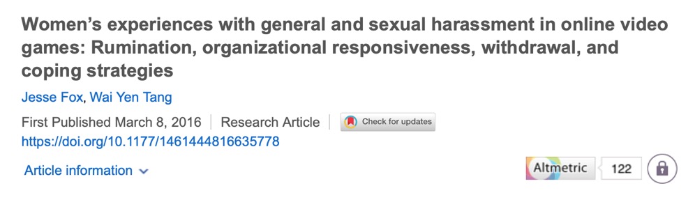 2017年Fox和 Tang在New Media & Society期刊发表的研究根据293位女性样本调查了在线电子游戏中女性遭受性骚扰的经历,包括骚扰的频率、对骚扰的思考(rumination)、对游戏公司做出解决骚扰问题努力的看法、退出游戏的比例。调查结果表明,女性报告的减轻骚扰的策略包括避免与其他玩家交流、通过网名或头像选择进行性别扭曲(gender bending)或者性别中立化(gender neutralization)、在游戏内外寻求帮助或社会支持。性骚扰以及其他形式的骚扰都具备女性从网络游戏退出的预测力。性骚扰将造成反思(rumination)以及随后的退出游戏。然而,从性骚扰到退出游戏的关联,也受到游戏组织解决是否有力的影响。
