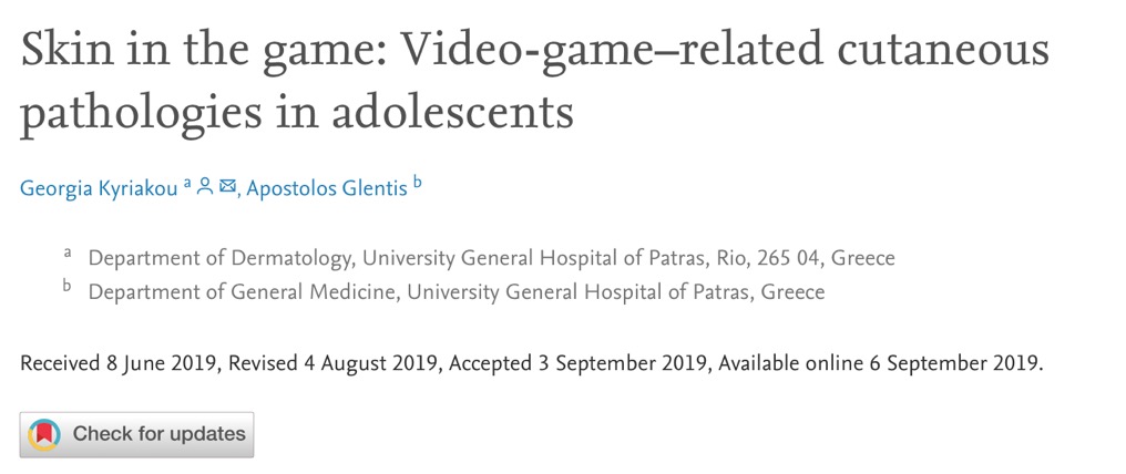 在游戏与玩家身心健康方面研究上,Kyriakou与 Glentis于2019年在International Journal of Pediatrics and Adolescent Medicine期刊发表了电子游戏与青少年皮肤病的关联的研究。