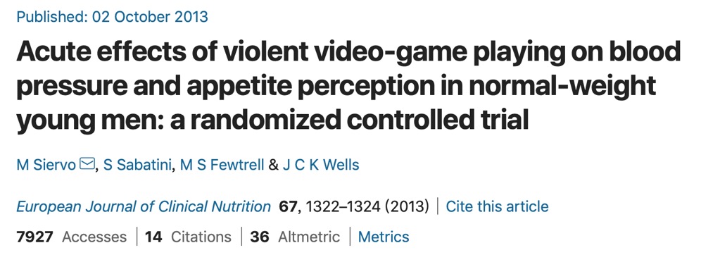 Siervo, Sabatini, Fewtrell和Wells则在2013年European Journal of Clinical Nutrition期刊发表文章,探究了玩暴力电子游戏与玩非暴力电子游戏对玩家的血压(BP)、食欲感知和食物偏好的短期影响。48位年轻(年龄范围:23.1±1.9岁)且体重正常(身体质量指数BMI:22.5±1.9 kg/m2)的男性参加了一项三手(three-arm)随机试验。被试分为三组,分别玩1小时暴力游戏,1小时竞争性非暴力游戏或者看1小时电视。对于被试的血压以及食欲感知在标准一餐(300大卡)前、干预中每隔1小时进行记录。实验结果显示,与其他两组相比,玩暴力游戏与舒张压显著增加有关(Δ±s.d.=+7.5±5.8 mm Hg;P=0.04)。此外,与玩非暴力游戏或看电视相比,玩暴力电子游戏似乎与血压增加和食欲感知增加具有相关性。