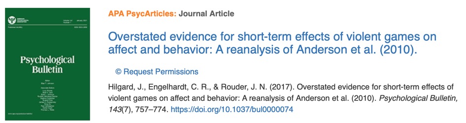 Hilgard, Engelhardt等人在2017年Psychological Bulletin期刊发表的研究中指出,暴力电子游戏被认为是“导致游戏玩家产生攻击性思想、情感和行为的重要原因”这一观点,主要来自于2010年Anderson等人进行的一项大型的元分析。 然而,Hilgard, Engelhardt等在研究中指出暴力电子游戏对情感的短期影响在上述研究中被高估。