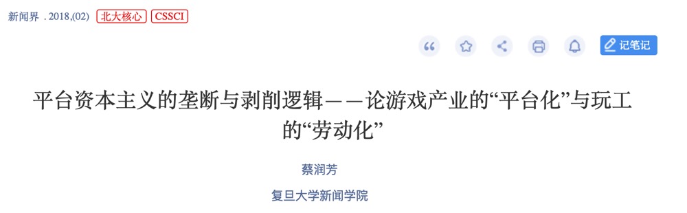 蔡润芳在2018年发表于《新闻界》的研究中则从传播政治经济学视角出发,聚焦电子游戏产业“平台化”与游戏玩工(playbour)在平台经济中“劳动化”过程,由此揭示以平台为核心的数字经济流通形式的平台资本主义垄断和剥削特征。一方面,研究认为游戏产业逐渐显现出具有社交属性的“平台化”特征。凭借起对信息数据、社交关系等新兴资源的垄断,得以形成以“数字劳动”为生产力,以互联网“价值网”为结构的新利益循环网络模式。另一方面,普通游戏玩家显现出“劳动化”趋向。在游戏中花费大量时间和精力,在玩游戏同时也为游戏公司和平台公司创造巨额利润,一方面作为产消玩工参与游戏内容生产,另一方面作为“你媒体(you media)”参与游戏营销。