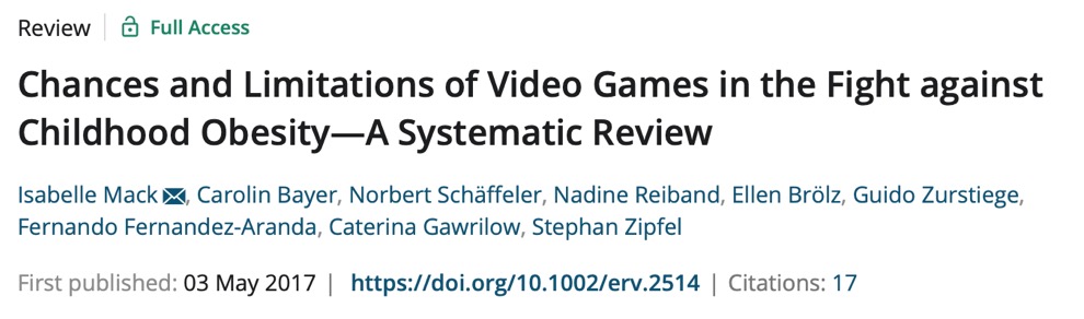 2017年,Mack等学者在European Eating Disorders Review期刊发表一篇文献回顾。为了评估视频游戏对抗和预防儿童肥胖症的可能与局限,进行了一次系统的文献搜索,对针对7至15岁儿童的营养、身体活动和肥胖的视频和电子游戏进行了一次系统的文献梳理。该研究区分了1)增长关于营养、饮食习惯和运动的知识的游戏;2)促进体育运动的游戏;3)结合上述两种方法的游戏。研究发现,这些电子游戏和视频总体而言被广泛接受并具有对缓解肥胖的积极影响。然而,研究指出,观察到的效果是很小的,因此电子游戏作为体重管理的方式无法带来满意的结果。电子游戏作为预防和治疗的手段,只能是辅助性的组成成分。