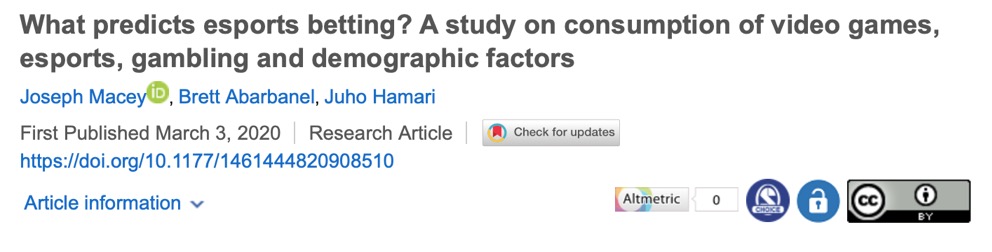 2021年Macey等在New Media & Society期刊发布了一项关于电子游戏消费、电子竞技、赌博和人口学因素研究。研究者对1368个样本进行调查,结果显示,观看电竞和参与一般形式的赌博都与电竞投注有直接联系。然而,研究者并没有观察到电子游戏消费和电竞赌注的直接联系。研究结果表明,虽然游戏能够作为赌博内容的载体,但没有直接鼓励赌博行为的内在因素。