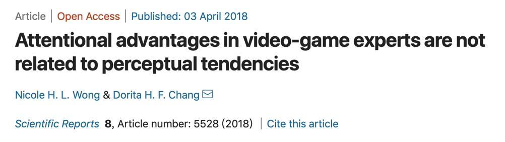 2018年Wong和Chang 在Nature发表的研究中,研究者通过全局与局部构成的分层刺激物。在两个实验中,研究对象被要求将注意力集中在全局的或局部的对象上。在每个RSVP试验中,研究对象被要求辨认初始物,并探察第二个目标物的是否出现。电子游戏能手显示出了明显较少的注意瞬断(attentional blink)(编注:注意瞬断指在快速连续地呈现两个目标刺激的情况下,第一个目标出现后的几百毫秒的时间内,人无法准确的辨别(甚至检测)出第二个目标刺激),这一结论通过其在全局注意还是局部注意中相比于非电子游戏能手展现出的更高的T2感知敏感性得出。研究者观测,观察到的视觉-注意力优势不大可能与单纯的感知倾向(即更大的全局有限性)差异相关。这一感知倾向被认为与注意瞬断减少相关。