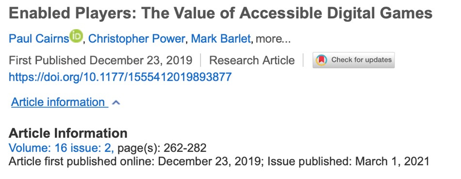 有学者对残疾人的游戏研究表明,玩电子游戏能够让残疾人感到自己有能力。2021年,Cairns等学者在Games and Culture期刊发表的研究通过对一个普通游戏社区的71名非残疾玩家与123名残疾玩家进行调查,询问受访是什么使游戏对其很重要。研究发现的既定游戏动机包括建立社会联系和逃避社会现实。但除此之外,也有玩家认为游戏对其而言是有益的且能够提供艺术体验。值得注意的是,残疾玩家明确提到游戏能帮助他们感到自己有能力,与非残疾玩家处于平等地位。研究者认为,这意味着构建对残疾者无障碍的游戏是提供残疾人与非残疾人有价值的联结的重要方式。