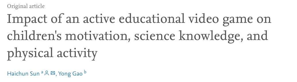 2016年Sun 和 Gao发表在Journal of Sport and Health Science期刊的研究表明,积极的教育电子游戏(AVGs)对小学生的学习动机有积极的影响,从而有利于提高其学习效果。在随机对照实验中,53名小学生被分配至实验组与对照组。实验组提供了AVG的学习环境,对照组则是基于久坐教育电子游戏(AVGs)。对学生们知识测试结果的反复方差分析结果显示,两组学生在后测中表现都好于前测(P<0.001,η2=0.486),在后测分数上两者没有显著差异。然而,实验组的学生新绿明显高于对照组的平均心率;同时实验组学生比对照组学生感受到更高的情境兴趣(p < 0.01,η2 = 0.301)。研究者由此认为,AVG通过提供愉快的学习经验和充足的PA(身体活动)使学生受益。然而在学习成绩方面,AVG没有显著效果。