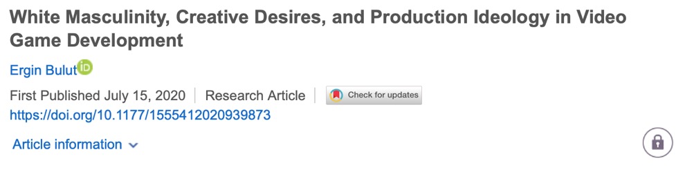 除了对电子游戏中性别因素的讨论,学者也对根植于种族意识、国别意识中的电子游戏生态进行讨论。2021年Bulut发表在Games and Culture期刊的研究对电子游戏发展中的白人男子气概、创作欲望(creative desire)、生产性(production)意识形态作出讨论。在其专著《帝国游戏》(Games of Empire)中,Bulut提出了“可笑的宗教性”(ludic religiosity)的概念,以揭示白人男子气概如何影响游戏工作者的专业化与、技术实践以及“可笑的欲望”(ludic desire)和想象的。经过三年的民族志研究,Bulut一方面试图证明游戏开发者是如何渴望生产“逃避现实者”(escapist)这一认知资本主义商品的,另一方面也试图在白人男性生产文化中重新思考意识形态背后的种族化和性别化的话语和实践。研究者认为,意识到种族化和性别化的实践和想象如何为全球游戏产业背后的欲望提供信息是至关重要的。