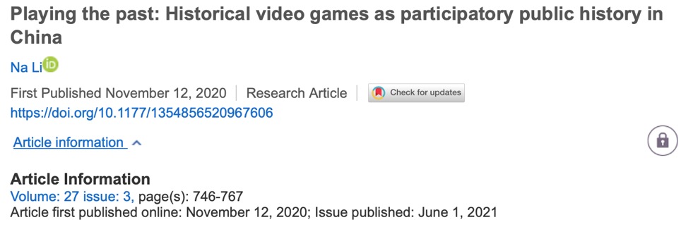 2021年Li在The Journal of Research into New Media Technologies期刊发表的文章探究了历史电子游戏的情感性、想象性和游戏性。研究表明历史题材电子游戏在中国的流行有利于玩家的历史意识培育以及反事实(counterfactual thinking)方法论培养。研究者认为,当媒体生态改变,新的进取和创造精神也彻底改变了历史信息流动方式。中国新一代具有战略眼光的公共历史学家的介入,将促进这一趋势进一步的发展。