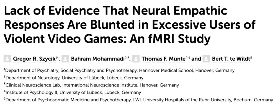 与其类似,Szycik, Mohammadi等人在2017年发表在Frontiers in Psychology期刊的研究中认为,暴力游戏对游戏玩家情绪处理的影响或许是短暂精准的,但是从长期来看暴力游戏玩家与非玩家在情感处理上没有差异。研究者通过将暴力性电子游戏的15名过度玩家与控制了年龄和教育变量的非玩家进行对比,研究结果表明,两组实验对象的大脑反应并没有显示出显著差异。