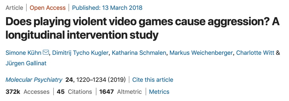 2019年Kühn等人在Molecular Psychiatry volume期刊发表的研究也表明,暴力电子游戏从长期来看不会增加成年人的暴力程度。在两个月的实验中,研究的三组被试每天玩暴力电子游戏《侠盗猎车手5》、非暴力电子游戏《模拟人生3》或根本不玩游戏。在实验干预前后,研究者对参与者的攻击性行为、性别歧视态度、移情和人际关系能力、冲动相关要素(寻求感觉、厌倦感、风险承担、延迟补偿)、心理健康(抑郁、焦虑以及执行控制功能)进行测量。研究结果表明,玩暴力电子游戏的组别与玩非暴力游戏组别或不玩游戏组别相比,没有明显的差异。