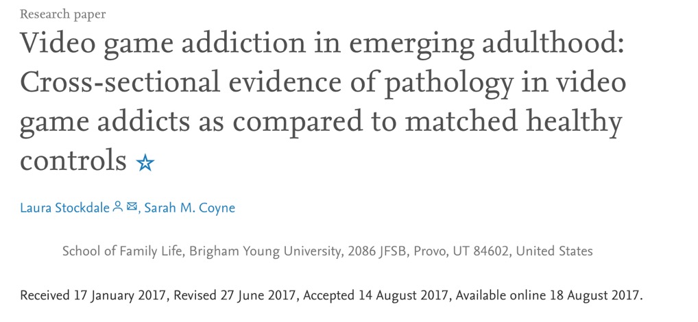 2018年Stockadale与Coyne在Journal of Affective Disorders期刊发表文章,对18-25岁年轻人的电子游戏成瘾情况进行研究,通过自我报告与调查的方法,将互联网游戏障碍量表(IGDS)定义下的网络游戏成瘾者与非成瘾者在精神状况、身体状况、社会情感健康等方面进行比较。结果显示,网络游戏成瘾者与非成瘾者相比,表现出更多的情绪障碍,如抑郁、焦虑、社会孤立感;更可能病态地接触网络色情内容。