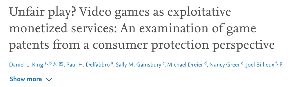 以战利品盒为代表的电子游戏货币化机制,本质上是玩家与游戏公司的不平等关系的体现。这一体现在游戏设计中即已凸显。2019年King等人在Computers in Human Behavior期刊上发表研究,对谷歌专利(Google Patents)上13项游戏内购买系统(in-game purchasing systems)专利的分析。分析内容涉及与消费者权利和保障相联系的专利受让人使用协议条款。研究认为,一些游戏内购买系统是不公平的甚至对玩家具有剥削性的。这些协议描述了系统通过信息优势(如行为跟踪)和数据操纵(如价格操纵)等方式激励玩家持续消费以促进游戏变现。与此同时,协议也表明游戏设置中为玩家提供了十分有限的或没有保护(如退款权利),并且其对弱势玩家(如问题玩家、青少年)具有更强的剥削性。研究者呼吁,为了保护游戏消费者的利益,需要适当的政策和消费者保护措施、心理学干预措施和游戏设计道德性准则的颁布。