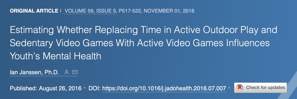 Janssen则在2016年Journal of Adolescent health期刊发表的一项研究中表明积极电子游戏(active video games AVGs)比久坐电子游戏(sedentary video games AVGs)更利于玩家心理健康,积极户外活动(active outdoor play AOP)比积极电子游戏更利于活动者健康。该研究以20122名6-10年级的加拿大青少年的代表性样本。暴露变量为每天花在AVGs, SVGs, AOP上的时间(小时/天)。心理健康程度则根据情绪问题、生活满意度、亲社会行为三个指标衡量。此外,同时间替代模型(Isotemporal substitution models)估计了用同等数量的AVGs时间代替花在SVG和AOP上的时间对心理健康指标的影响程度。结果表明,用1小时/天的AVG取代1小时/天的SVG,与6% 的高情绪问题减少有关,与4% 的高生活满意度增加有关,以及与13% 的高亲社会行为增加有关。用1小时/天的AVG代替1小时/天的AOP与7% 的高情绪问题概率增加有关,与 3% 的高生活满意度概率减少有关,与6%的高亲社会行为概率减少有关。