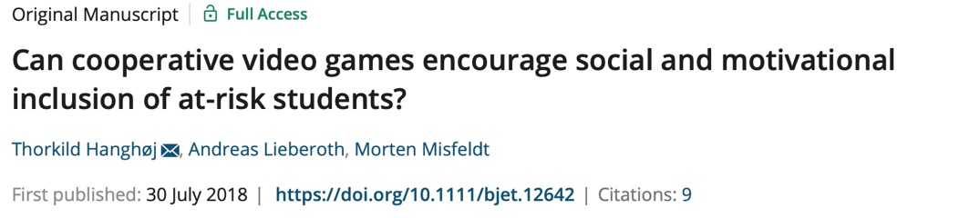 电子游戏作为一种干预手段也可以在教育上应用。2018年Hanghøj, Lieberoth和 Misfeldt在British Journal of Educational Technology期刊的研究表明,合作性游戏(cooperative video games)可以从多维度对“问题”学生的课堂融入产生积极影响。
