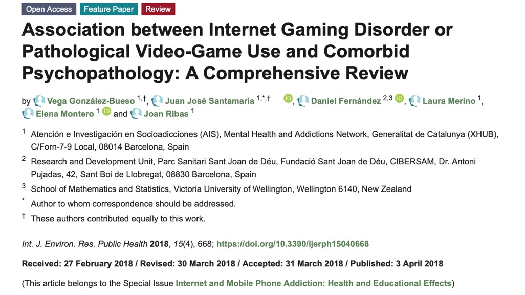 研究发现几个显著相关性的变量:92%的网络游戏障碍(IGD)与焦虑相关,89%的IGD与抑郁相关,85%的IGD与注意缺陷障碍(ADHD)症状相关,75%与社交恐惧症/焦虑和强迫症状相关。此外,大多数研究表明男性的IGD发病率较高。然而,文章也表示,由于缺少纵向研究、缺少与既有结论矛盾的研究发表,研究者无法检测变量之间关联的方向性。