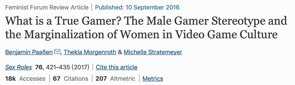 2017年Paaßen, Morgenroth 和Stratemeyer在Sex Roles发表的文章中,探究了电子游戏文化中男性玩家的刻板印象与女性玩家在其中的边缘化角色。研究者认为,女性玩家与男性玩人数大致相同,但是电子游戏仍然被认为与男性有更加密切的关系。这一刻板印象的常见理由是,尽管女性也许会玩游戏,但她们不应该被认为“真正”的游戏玩家,因为与男性玩家相比,她们玩得更随意、更不熟练。在研究中,研究者回顾了现有的关于性别和游戏的文献,从系列论文的准确性、持久性、影响、未来展望的角度来研究男性游戏玩家的刻板印象。研究结果表明,刻板印象所描述内容的准确性取决于对“游戏玩家”的定义。研究者认为,由于几乎所有游戏文化中的专业者及高度可见的人物都是男性,且达到中等水平的女性玩家则容易被忽视或由于各种因素选择主动边缘化,由此造成了对游戏玩家基于性别的刻板印象。研究者进一步提出,男性玩家刻板印象会对女性造成伤害,使她们无法享受到电子游戏带来的积极成果,如进入科学技术和工程领域的机会。
