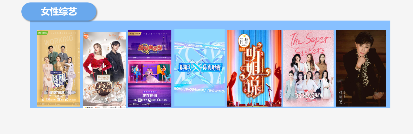 所谓“她综艺”,就是以女性为综艺主角,围绕女性的生活、工作、情感、社交等话题展开讨论,折射当今社会中女性三观想法的综艺,芒果TV去年上线的《乘风破浪的姐姐1》堪称巅峰之作。此外还有《上班啦!妈妈》、《女儿们的恋爱》、《了不起的姐姐》等着眼于职场妈妈、女性恋爱日常及演技比拼的创新“她综艺”,也备受观众欢迎。