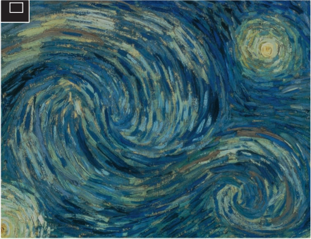 《星空》是一幅令人不知所措的作品。站在它的面前,一种强烈的感受扑面而来。天空中,画家用颜料编织了一张狂野的网络,所有规则被他抛在脑后,蓝色的夜空被汹涌的激流吞噬,泛出点点星光。面对此情此景,我们怎么会感受不到画家内心的痛苦?
