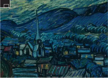 村庄像一座超现实的海市蜃楼,它镶嵌于星空下,成为另一幅景观。中间的教堂并不像普罗旺斯常见的基督教建筑,它更像一座北方的建筑。地平线因阿尔皮耶山脉而富有生气,它是这幅画中最写实的部分。