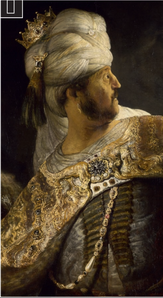 巴比伦国王伯沙撒生活于公元前6世纪,其父王是尼布甲尼撒。在这幅画中,他包着带有羽毛装饰的头巾,身披毛皮斗篷,上面挂着沉重的珠宝链子。对于这一形象,伦勃朗借鉴了穆拉德三世(Mourad III)的相貌,这位奥斯曼苏丹的肖像版画在欧洲广为流传。