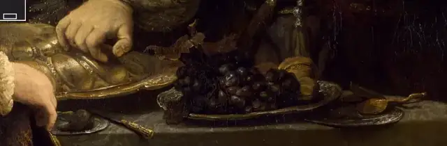 食物盛放在从耶路撒冷的神殿夺来的圣器里,宴会上的宾客酒肉正酣。此时墙上闪现一串文字,打破了喜庆的气氛。近景中这串丰硕的葡萄是画中唯一具有立体感的图案,葡萄在《圣经》中多次出现,例如上帝在应许之地种下的葡萄,希伯来人在摩西的带领下前往那里;在最后的晚餐中,耶稣与使徒共饮的美酒也是用葡萄酿成的。