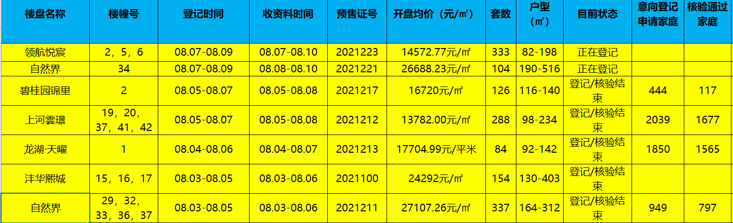 上周(8月2日-8月8日)西安6盘登记,具体楼盘包括:自然界、沣华熙城、龙泽·天曜、上河雲璟、碧桂园锦里、领航悦宸。