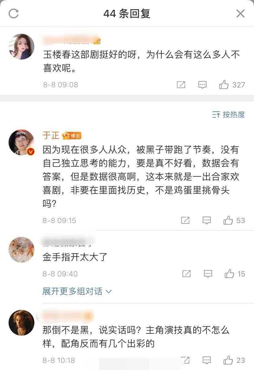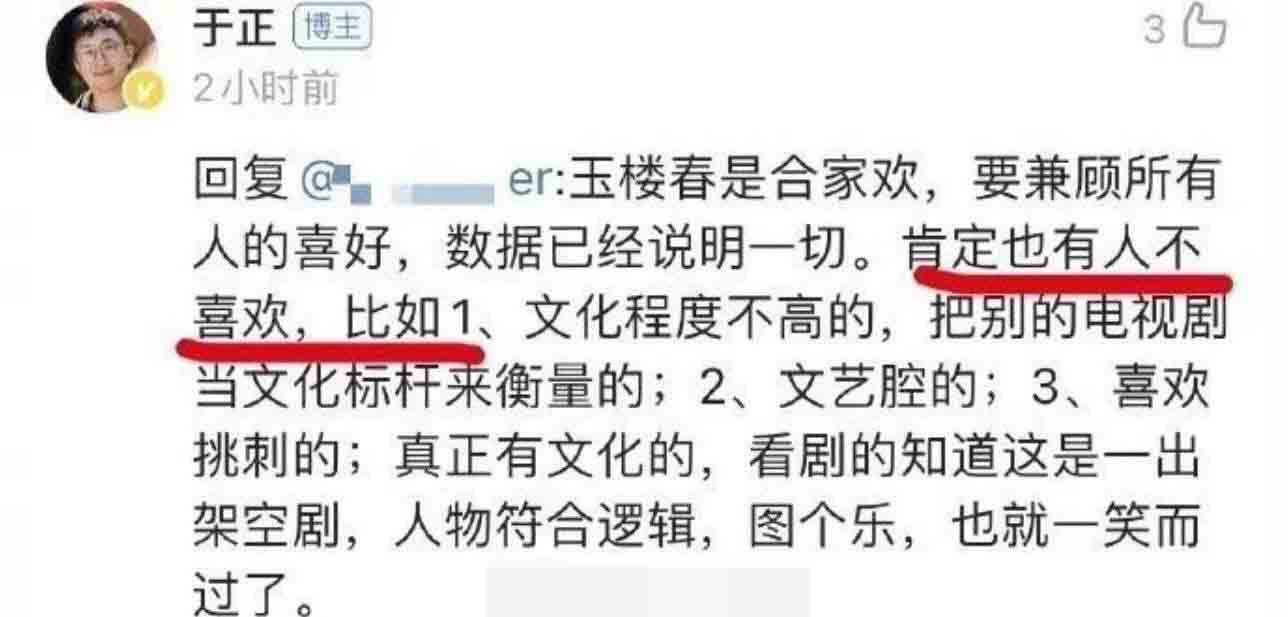 这就真的让人不舒服了吧?于正的话是什么意思?喜欢看《玉楼春》的就是文化程度高的,不看《玉楼春》或者不喜欢的人就是文化程度低的?这不就跟一部电影不卖座然后导演嘲讽观众不配看电影一个样吗?