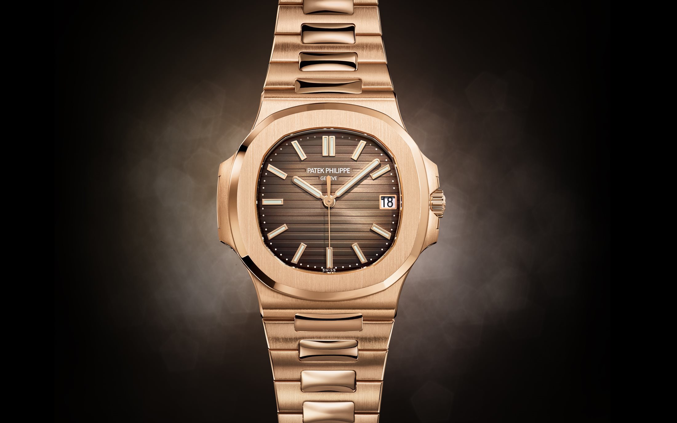 这款百达翡丽运动优雅系列5711/1R-001腕表采用18K玫瑰金打造,表壳直径40毫米,厚度8.3毫米,具有120米防水性能。棕色表盘与玫瑰金搭配非常和谐,盘面的金质立体时标与指针覆有荧光涂层,方便在黑暗的环境中清晰读时。3点钟位置设有日历显示窗口,方便实用。内部搭载Cal.324 SC自动上链机芯,可提供45小时动力储存。