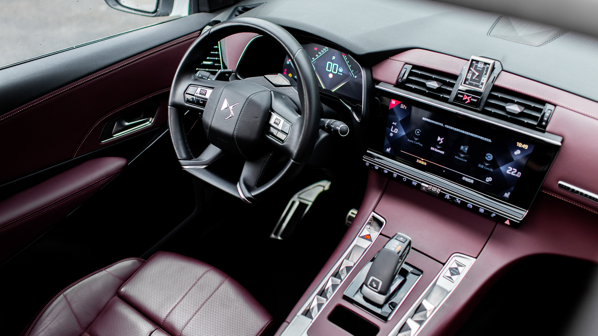 内饰的设计上,DS7也绝对算得上独树一帜,红色的皮面覆盖了内饰的大部分,看起来确实有种法国奢侈品包包的味道,而更多的惊喜,还是要把很多细节直接放大来看。