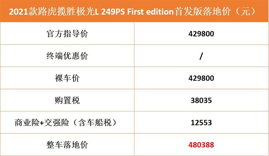 我们以上海地区2021款揽胜极光L 249PS First edition首发版为例,其官方指导价为429800元,由于新车刚上市,目前没有终端优惠,裸车价也就是指导价,为429800元。同时,购置税价格为38035元;商业险包含车损险与第三方责任险等,加上交强险(含车船税),共为12553元,总共落地价为480388元。如果4S店再收取服务费与装潢费之类费用的话,那么最终落地价还会更高,因店而异。