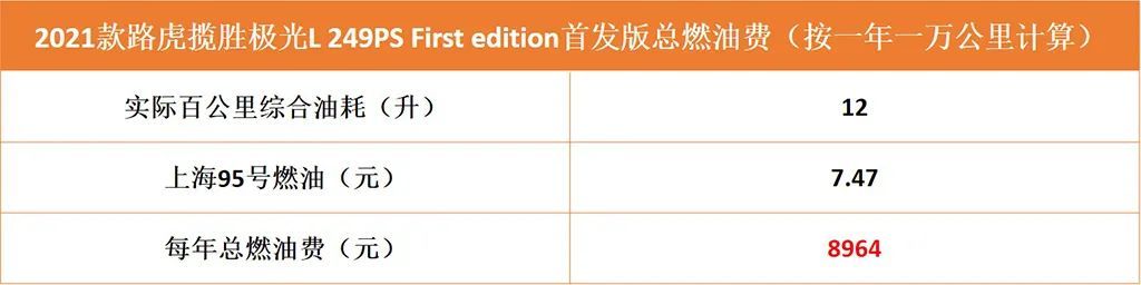 全新路虎揽胜极光L全系搭载一台Ingenium 2.0T发动机,需要添加95号汽油。由于新车刚上市,市场实际油耗表现没有太多样本,所以此次就拿2020款标轴版车型实际百公里综合油耗12升作为参考,当前上海地区95号燃油每升为7.47元,按照每年一万公里行驶里程来看的话,总燃油费用为8964元。