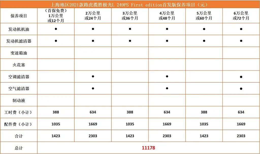 全新路虎揽胜极光L上海地区提供免费首保,提车5000公里左右或半年进行首保,之后每1万公里或12个月进行一次保养。从表格中看到,揽胜极光L基本保养机油和机滤再加上工时费,总共价格为1423元,符合多数豪华品牌保养价格水平;而大保养在60000公里或72个月时间内基本没有,无论整体保养间隔还是价格、项目等都挺合理。