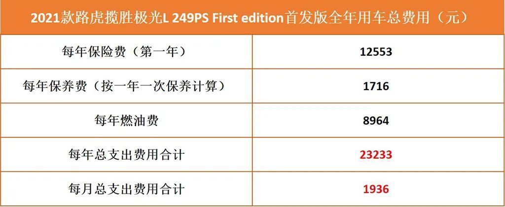 我们最后来看看全新路虎揽胜极光L一年用车成本呀多少?第一年保险费用共为12553元;而保养费用我们按照一年保养一次来推算的话,平均为1716元;总燃油费共为8964元;那么一年所产生的必要花费共为23233元。一年用车总成本平摊到每月的话,平均为1936元左右,这个月均花费成本相信多数消费者都负担的起。