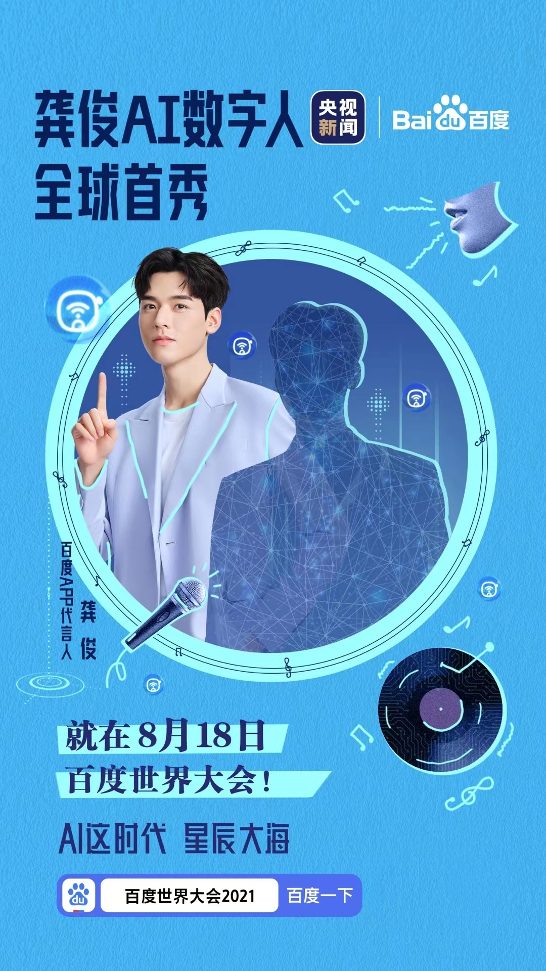 百度世界大会2021将在央视新闻客户端、百度App、百度直播、爱奇艺、B站等央视新闻官方账号同步直播放送。打开百度App搜索“百度世界大会2021”预约直播,解锁关于龚俊的精彩内容。