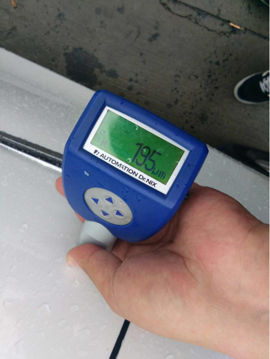 左前门漆面超出正常数值太高,边缘处有些粗糙和飞漆痕迹,左前门喷漆。