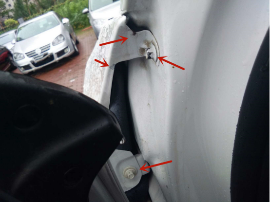 左前翼子板固定螺丝拆卸,边缘参差不齐还有后喷漆的痕迹,左前翼子板更换。