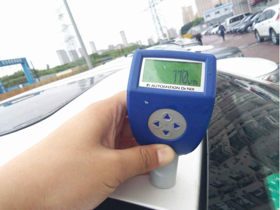 这辆长安CS75的正常漆面数值是110左右,有人喷漆的话一般很少喷车顶,很多人以车顶漆面数值为采样,这辆车的车顶没有漆面修复痕迹。
