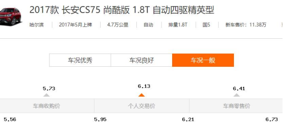 这辆长安CS75是2017款尚酷版1.8T自动四驱精英型, 2017年5月上牌,表显里程:4.7W公里,新车指导:11.38W,卖方报价:6.1W。