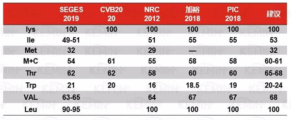 理想氨基酸模型通常用SID AA与SID lysine的比值表达。 如下表2是对6-30Kg乳仔猪的理想氨基酸模型建议及比较,供大家参考。