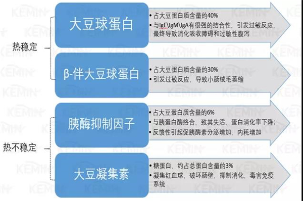 图2显示了大豆中主要的4种蛋白类抗营养因子,其容易造成肠道过敏反应,小肠绒毛萎缩,抑制胰蛋白酶,从而降低蛋白的消化吸收和引起仔猪腹泻。 热不稳定的胰蛋白酶抑制剂和大豆凝集素可以通过加热解决,而热稳定的大豆球蛋白和伴球蛋白需要通过原料处理或者日粮添加蛋白酶来解决。