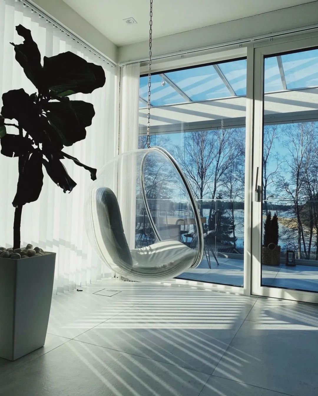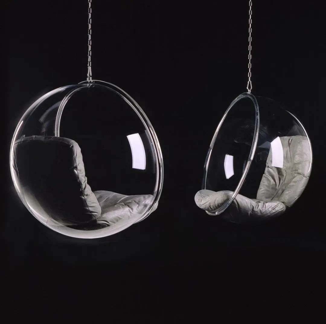 梦幻且舒适的 Bubble 吊椅,由亚克力和镀铬钢制成,一端被悬挂在屋顶之上,透明的球身在阳光的照射之下如同一个巨大的泡泡一般,盘腿于上,静坐阅读既不会影响光线又打造了浓浓的氛围感;