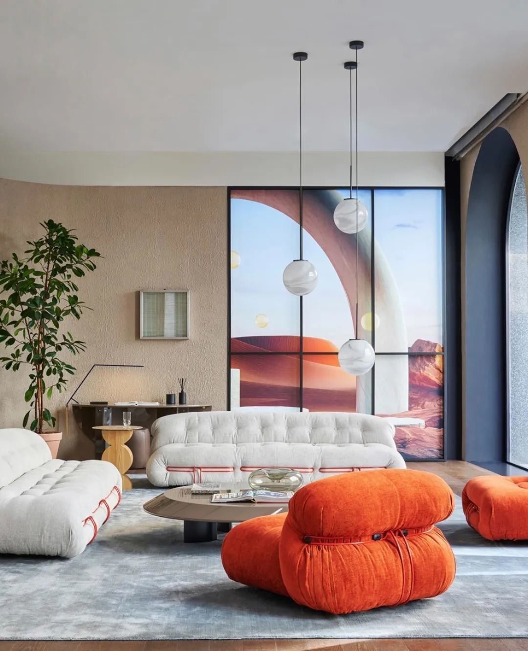仅仅是 1972 年度 Le Bambole、1984 年度 Sisamo 和 1986年度 Sity 等作品就足以惊艳全世界,后问世的极具线条张力的 Moon system 月亮沙发实现了现代美学和人体工学的两者统一,将舒适与美感完美地融入了每一个模块,以一种常人无法看透的几何形式既展现了沙发的动态美,又增加了其产品的艺术气息。