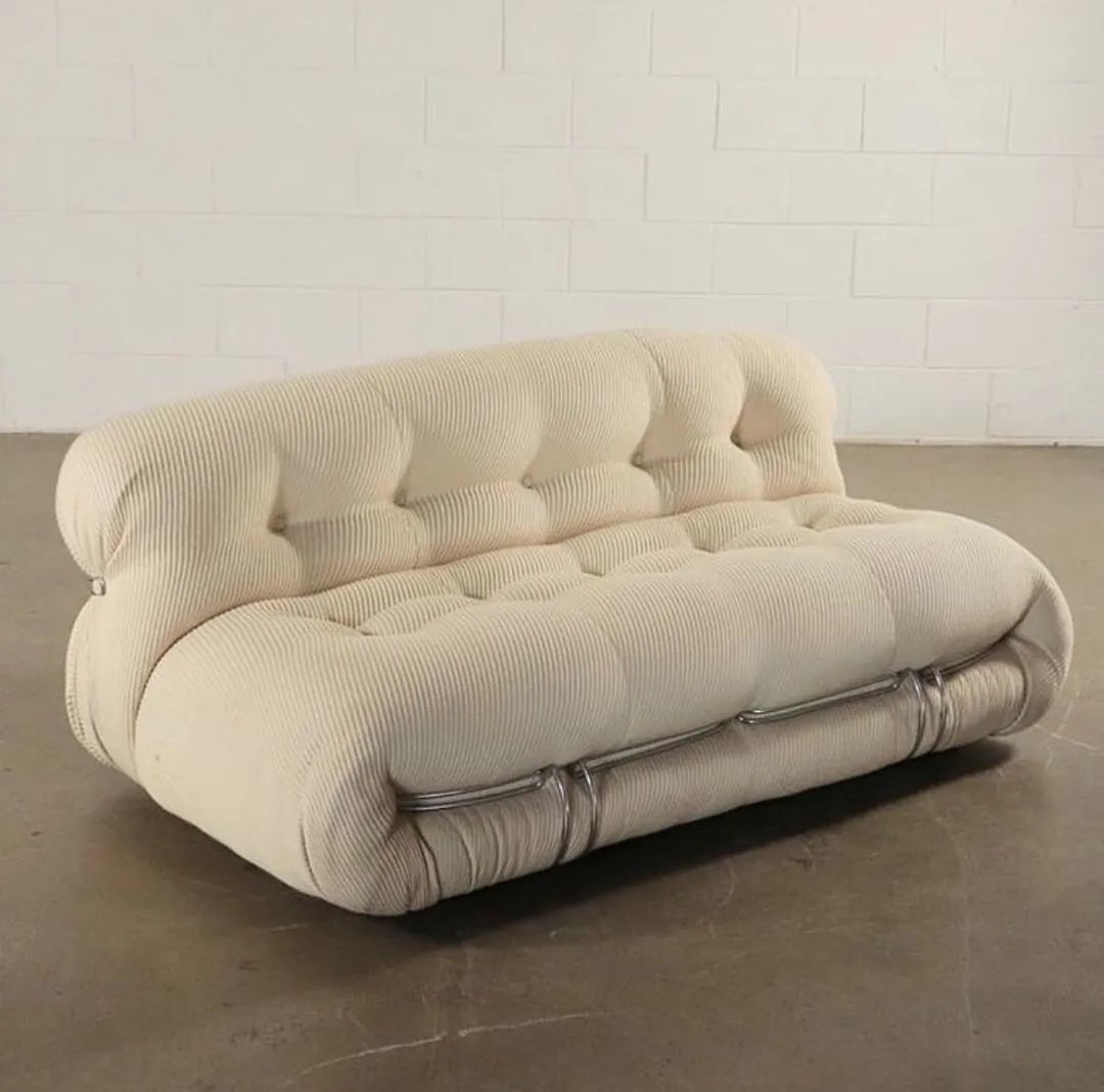 Soriana 沙发就诞生于上世纪七十年代,1982 年停产之后,经过不断的更新,终于在 2021 年复产,圆滚滚胖乎乎的外形,臃肿不失美感,沙发下层的钢圈起到固定沙发的作用,如同婴儿带上了牙箍,诙谐时尚。