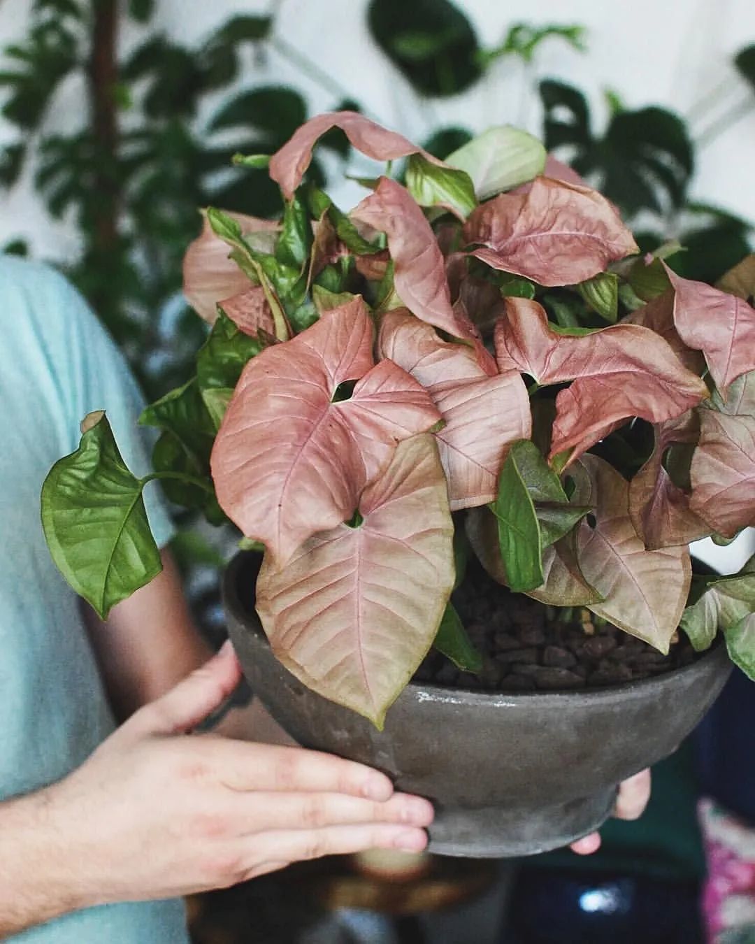 合果芋有一些叶子斑斓的品种,包括粉佳人合果芋,它适合养在室内半阴处,每天有适当的散射光就能生长良好,养护的时候注意保持环境温暖,定期补充水分,避免过度干旱。