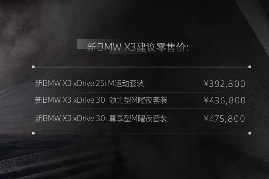 日前,新款宝马X3正式上市,新车共推出3款车型,售价区间为39.28-47.58万元。