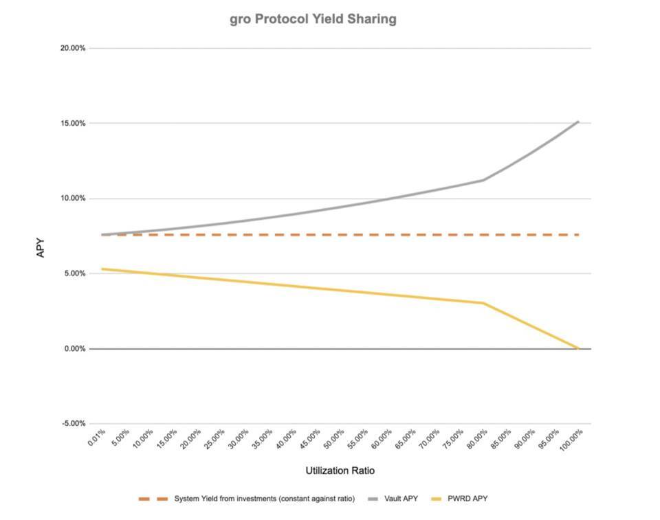 如前所说,PWRD 和 Vault 的风险和收益各不相同,另外,Gro 还允许用户进一步对其风险进行分层,即,允许将其中一种产品的收益划转至另一种产品,来换取更多的保护或收益。尽管二者不可兼得,但可根据用户喜好来对其所能接受的风险和收益进行管理。这意味着,当 PWRD 锁仓量与 Vault 锁仓量之比(利用率)低时,保护成本较低 PWRD 更具吸引力,当利用率高时,收益较高 Vault 将更受欢迎。